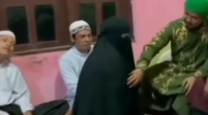 Terlihat jelas salah satu dari kyai yang sedang duduk di kursi itu meraba-raba tubuh perempuan bercadar tersebut. Bahkan, ia sempat mengintip wajah di balik cadar wanita itu.