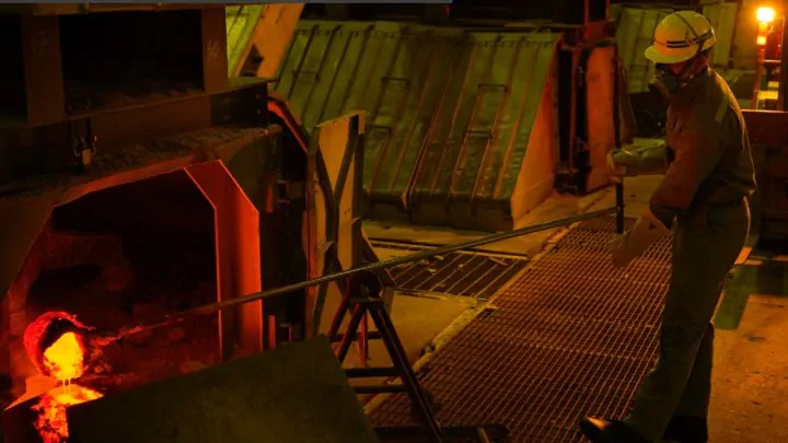 Di dalam pabrik, deretan tungku peleburan tampak beroperasi tanpa henti. Di antara cahaya kekuningan dan suara logam, beberapa petugas terlihat mengenakan alat pelindung diri lengkap (helm, pelindung wajah, sarung tangan tahan panas), serta membawa peralatan tapping. Mereka berdiri di tepi tungku, mengaduk aluminium cair yang mengalir seperti lahar, bersuhu sekitar 960 derajat celsius.