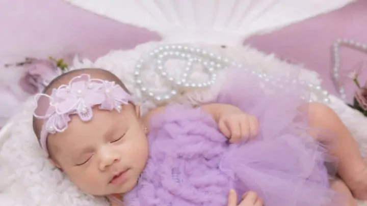 foto sang bayi yang sedang tertidur mengenakan gaun berwarna ungu, lengkap dengan hiasan pita di kepala.